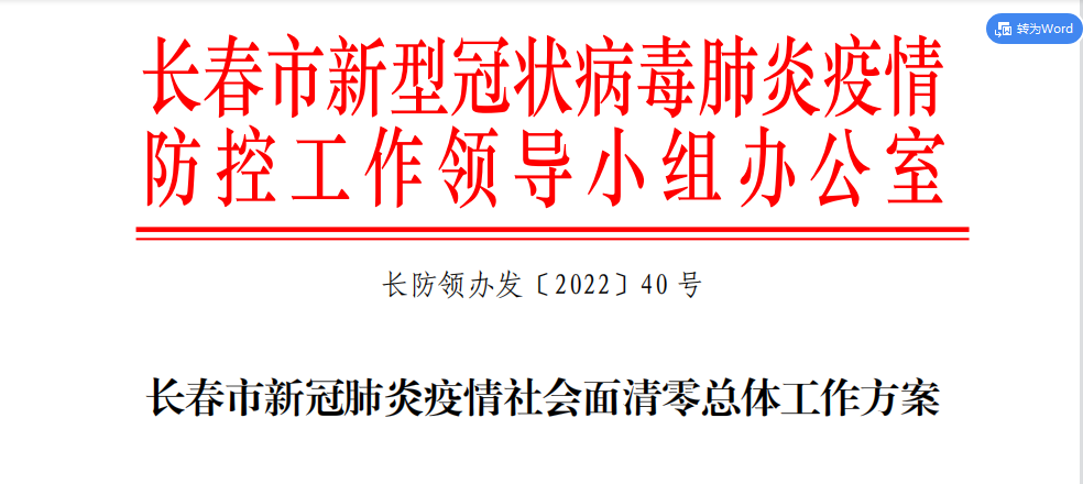 根据我看到的一份长春市新型冠状病毒肺炎疫情防控工作领导小组办公室下发的长防领办发〔2022〕40号《长春市新冠肺炎疫情社会面清零总体工作方案》:3月26日至29日,按照“提级管控、统一指挥、分类施策、集中攻坚”的总体思路,集中利用2天时间,采取“全域静态管理、全员核酸检测、全面流调排查、全民清洁消杀、全程查漏补种”等综合防控措施,做到“应检尽检、应隔尽隔、应治尽治、应管尽管、应消尽消”,实现本地疫情无外溢、社区感染零新增、密接次密接社会面清零的总体工作目标。