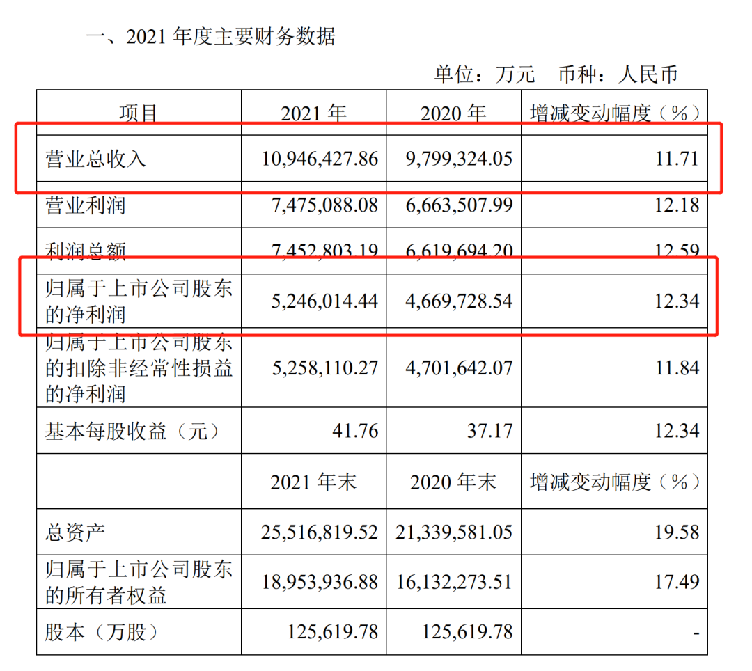3月28日晚间,贵州茅台披露,2021年实现营业总收入1094.6亿元,利润总额745.2亿元;实现净利润524.6亿元,同比增长12.34%。