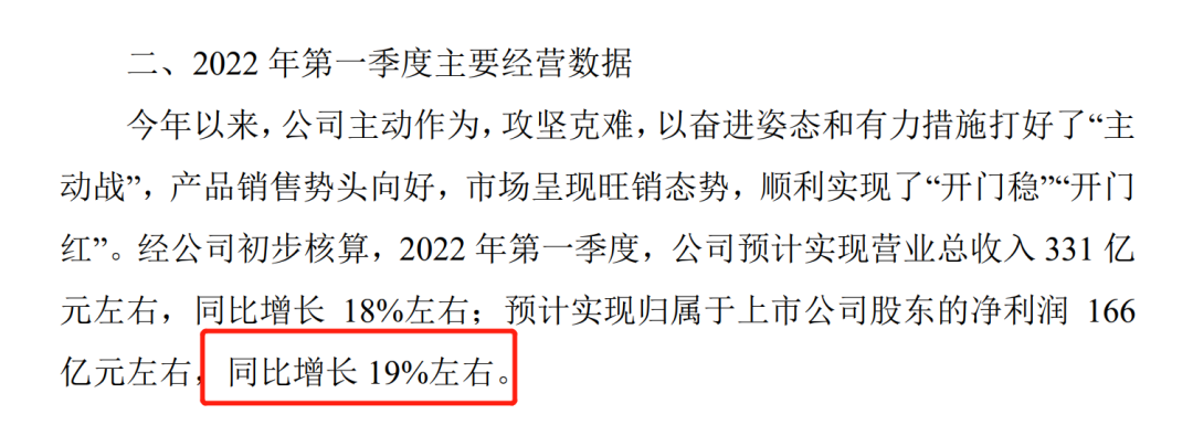 贵州茅台预计2022年第一季度实现营业总收入331亿元左右,同比增长18%左右;预计实现归属于上市公司股东的净利润166亿元左右,同比增长19%左右。