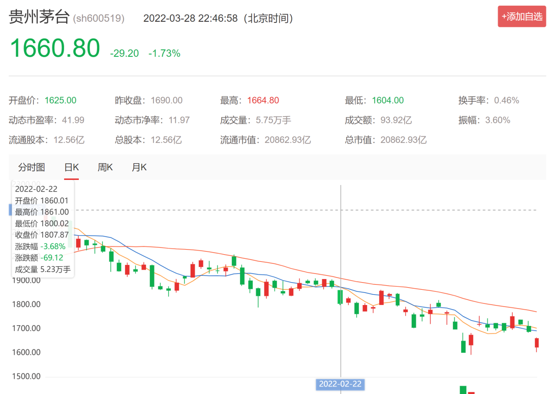 意外的是,茅台销售新平台上线,股价却一度大幅走低。3月28日一开盘,贵州茅台(600519)一度暴跌超5%,股价逼近1600元。随后,随着指数转暖,贵州茅台跌幅有所收窄。截至收盘,贵州茅台跌1.73%,报1660.8元,最新市值20863亿元。