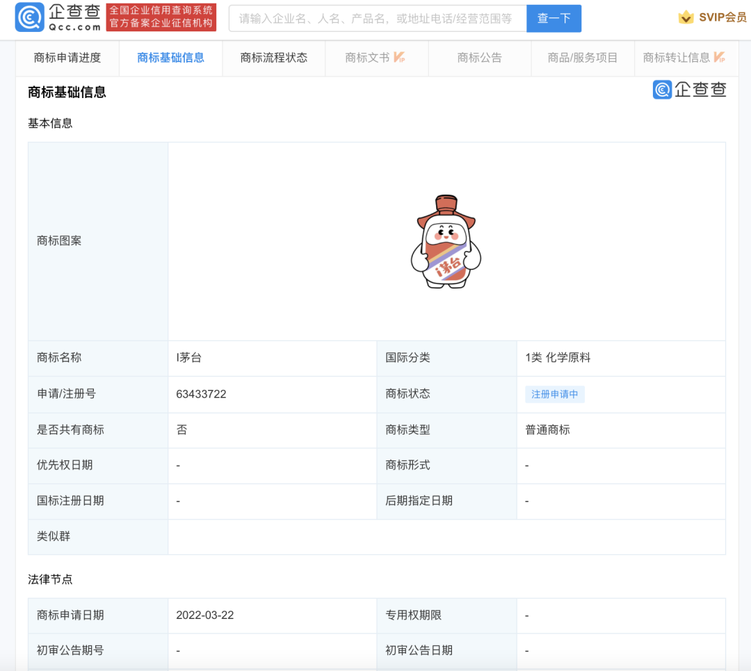 此外,企查查APP显示,中国贵州茅台酒厂(集团)有限责任公司于近日申请“I茅台”相关商标,核准注册在全品类45项上,商标状态为“注册申请中”。