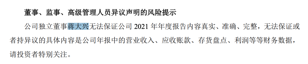 年报中,莱宝高科提示,独立董事蒋大兴无法保证公司2021年年度报告内容真实、准确、完整,无法保证或者持异议的具体内容是公司年报中的营业收入、应收账款、存货盘点、利润等等财务数据,请投资者特别关注。