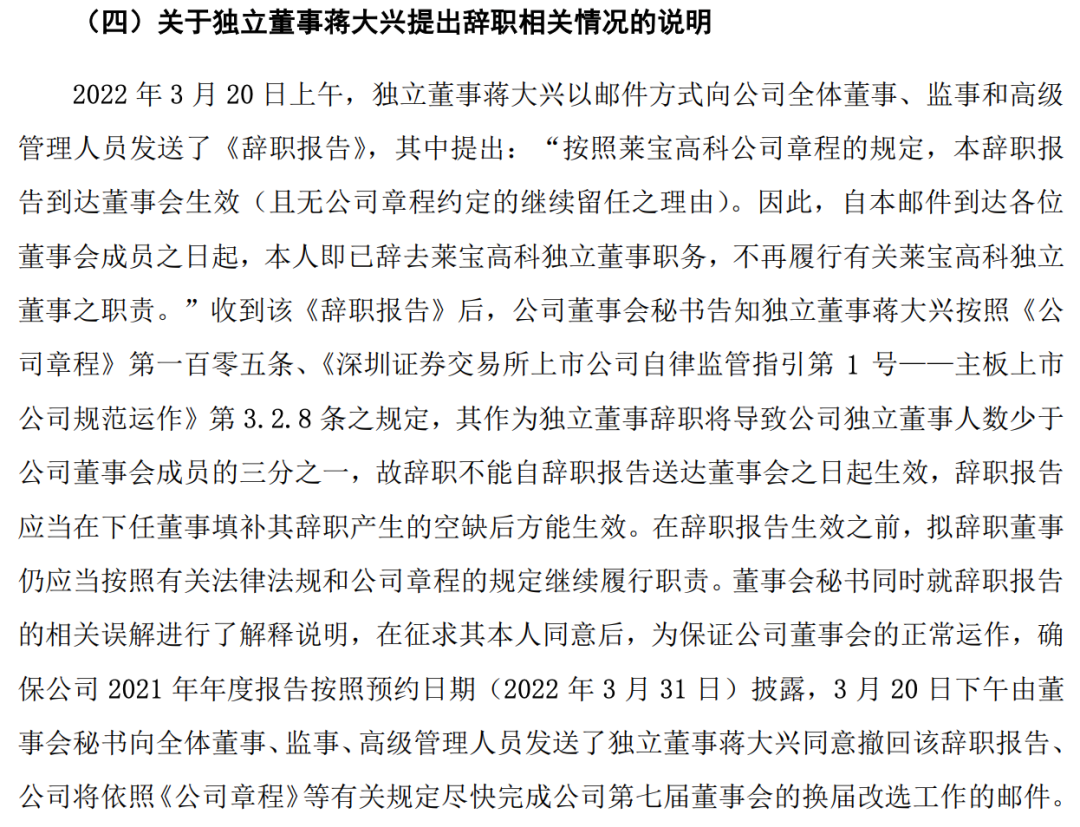在同日发布的另一则公告中,莱宝高科详细披露了蒋大兴对年报争议的由头和来回经历。