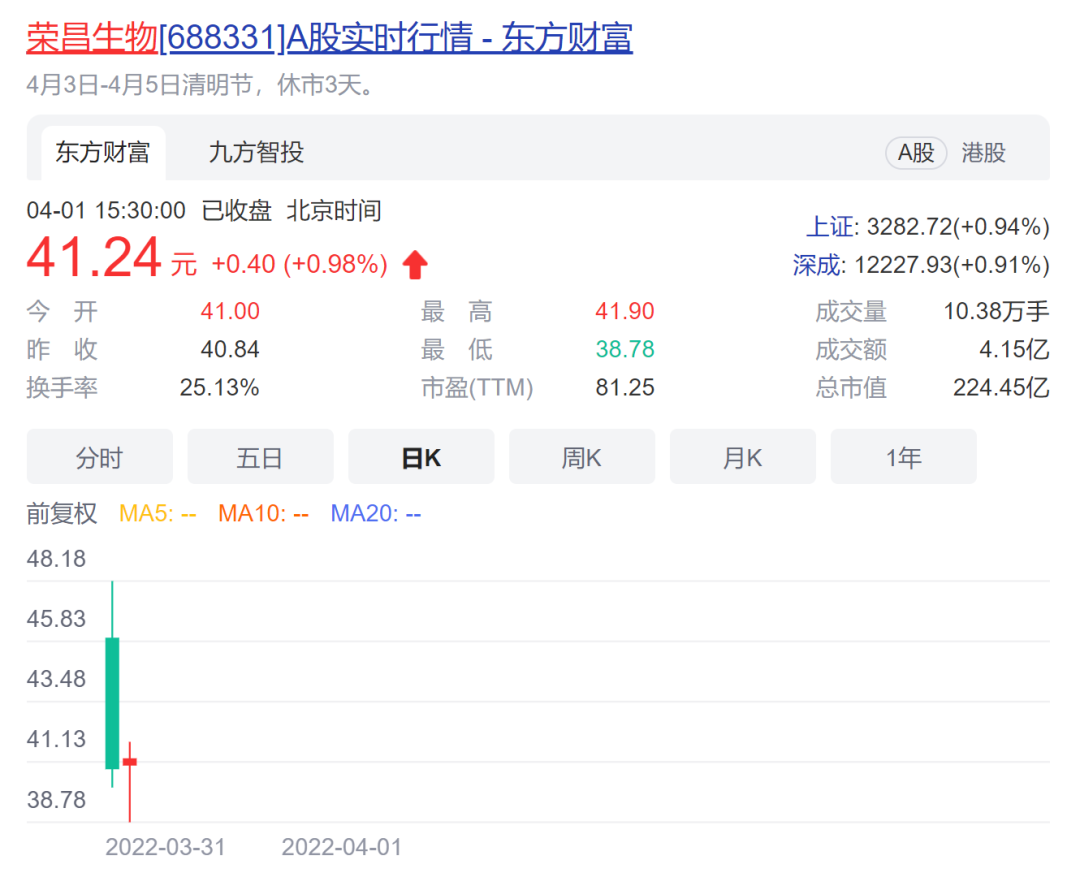 荣昌生物发行价格为48元,上市首日开盘报46元跌破发行价。截至收盘,荣昌生物报40.84元,跌幅14.92%,为本周上市新股中首日跌幅最大。另一方面,截至4月1日发稿时止,荣昌生物报收43.55港元,也跌破港股发行价52.10港元。