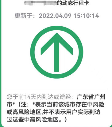 4月9日午后,身处广州市天河区的证券时报·e公司记者突然接到朋友电话,询问行程码是否带星。记者迅速查阅行程码证实了这一情况。据记者获悉,虽然带星暂时不会对市民出行带来太大影响,但包括公园、博物馆等一部分场所已经要求带星人员需出示核酸阴性证明才可放行进入。