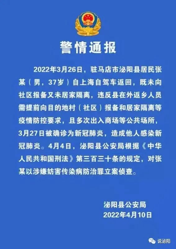2022年3月26日,驻马店市泌阳县居民张某(男,37岁)自上海自驾车返回,既未向社区报备又未居家隔离,违反县在外返乡人员需提前向目的地村(社区)报备和居家隔离等疫情防控要求,且多次出入商场等公共场所,3月27日被确诊为新冠肺炎,造成他人感染新冠肺炎。4月4日,泌阳县公安局根据《中华人民共和国刑法》第三百三十条的规定,对张某以涉嫌妨害传染病防治罪立案侦查。