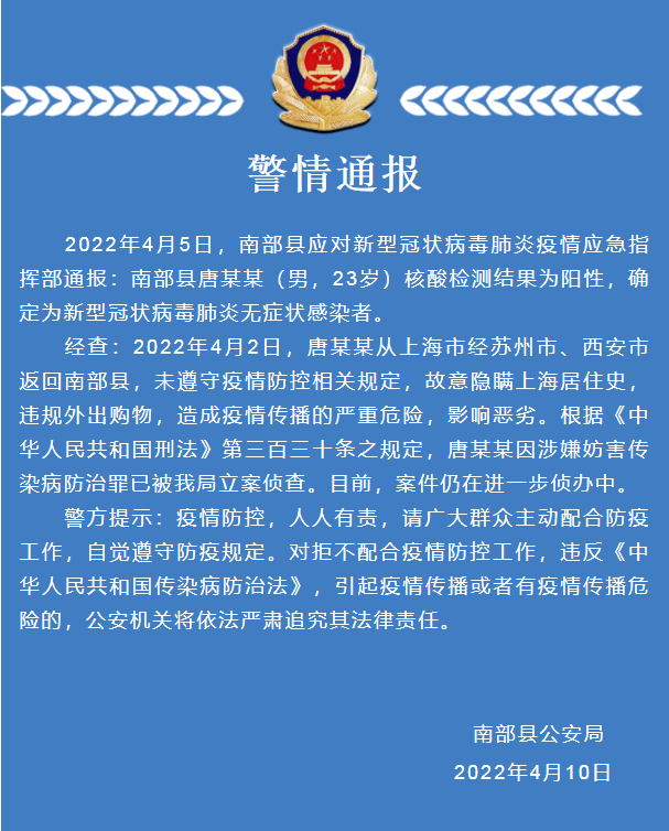 2022年4月5日,南部县应对新型冠状病毒肺炎疫情应急指挥部通报:南部县唐某某(男,23岁)核酸检测结果为阳性,确定为新型冠状病毒肺炎无症状感染者。