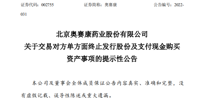 然而,这一交易如今又迎来新的变数。2022年4月17日晚间,奥赛康公告称,近日公司接到此次交易的交易对方通知,其单方面要求终止此次交易的相关协议。公司正与交易对方沟通,但未取得实质性进展。
