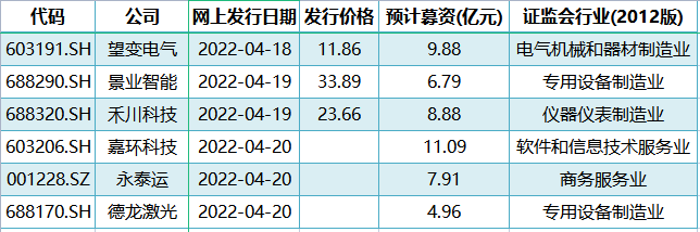 据目前安排,4月18日到22日共有6只新股申购,包括科创板3只,上证主板2只、深证主板1只。