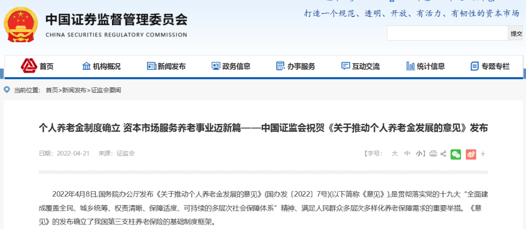 4月21日,面对《关于推动个人养老金发展的意见》的正式发布,中国证监会迅速发文祝贺称“个人养老金制度确立 资本市场服务养老事业迈新篇”,《意见》的发布确立了我国第三支柱养老保险的基础制度框架。