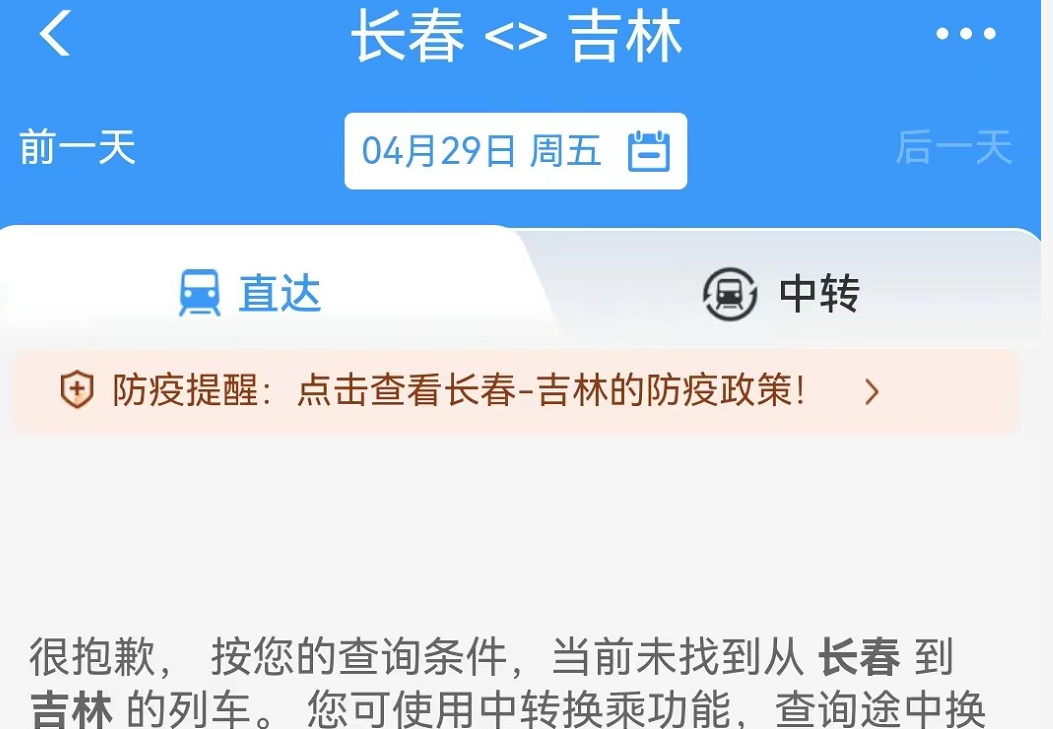 昨日有消息称,目前已经可以查询到4月28日长春至吉林的铁路购票信息。4月24日晚、4月25日早,我先后多次通过“铁路12306”APP查询最近5天长春至吉林的票务信务,均显示“很抱歉,按您的查询条件,当前未找到从长春到吉林的列车。”