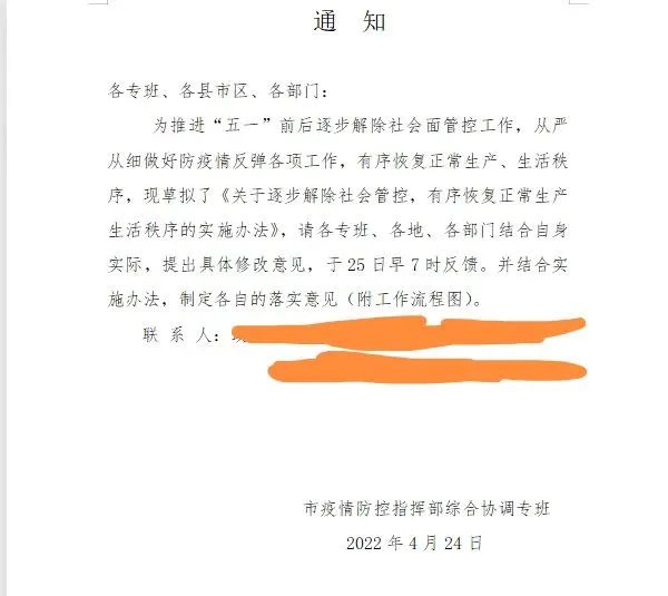 另外,《征求意见稿》的上方还有一份通知:为推进“五一”前后逐步解除社会面管控工作,从严从细做好防疫情反弹各项工作,有序恢复正常生产、生活秩序,现草拟了《关于逐步解除社会管控,有序恢复正常生产生活秩序的实施办法》,请各专班、各地、各部门结合自身实际,提出具体修改意见,于25日早7时反馈。并结合实施办法,制定各自的落实意见(附工作流程图)。