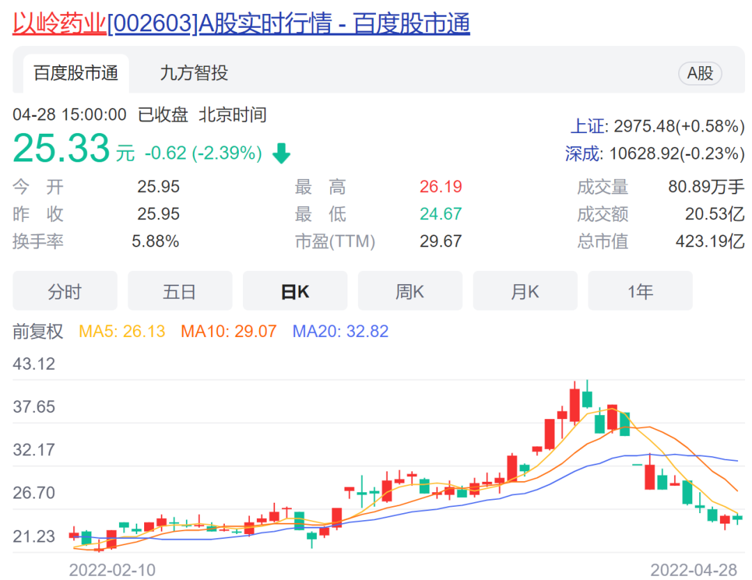 但受近期争议影响,以岭药业股价净利A字反弹,截至4月28日收盘,以岭药业报收25.33元/股,跌2.39%。而自4月12日以来,该公司股价跌近40%。
