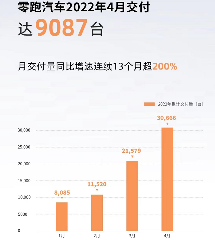 5月1日,造车新势力五强集体披露4月交付量数据。其中,零跑汽车4月销量9087辆,同比增长228%,环比微跌0.10%,位居造车新势力榜首,而这也是零跑汽车首度反超“蔚小理哪”,跃升为交付量冠军。2022年1-4月,零跑汽车累计交付30666辆。