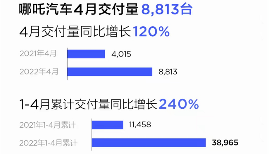 同日,哪吒汽车也披露了4月交付量“成绩单”,共交付新车8813辆,同比增长120%,环比下滑26.71%。1-4月,哪吒汽车累计交付38965辆,同比增长240%。