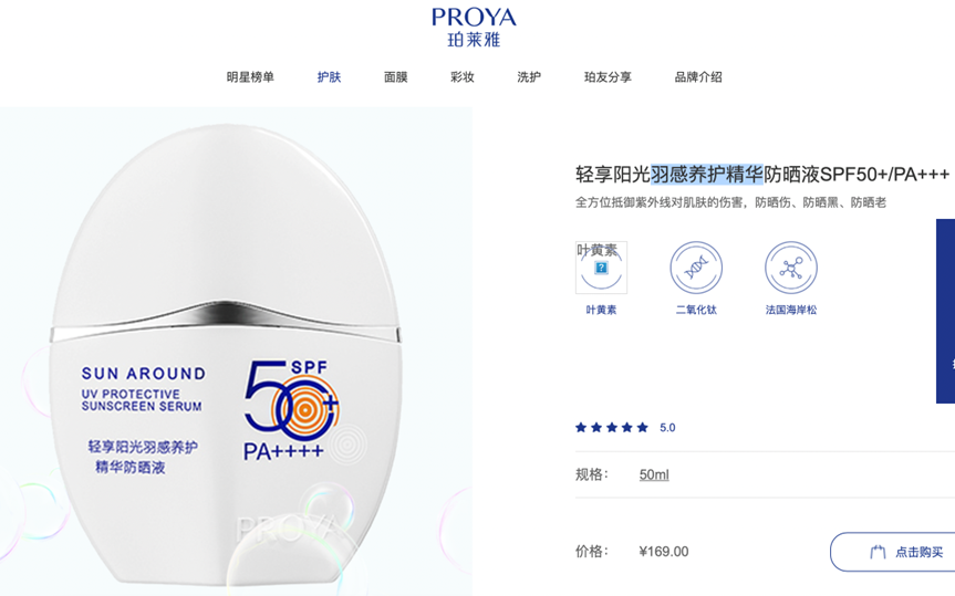 5月3日,记者登陆珀莱雅官网,产品信息显示,50ml规格的售价为169元。