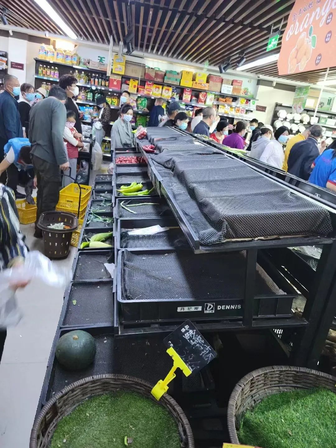 “半小时前这超市还没什么人,一晃眼的功夫,菜都买不着了。”在门外观望的郑州市民吴先生称,虽然郑州市在4月2日及3日连续做了两天主城区全员核酸,也有少数几个关于阳性病例的通告,但事态严重到需要抢购至此,还是令他出乎意料。