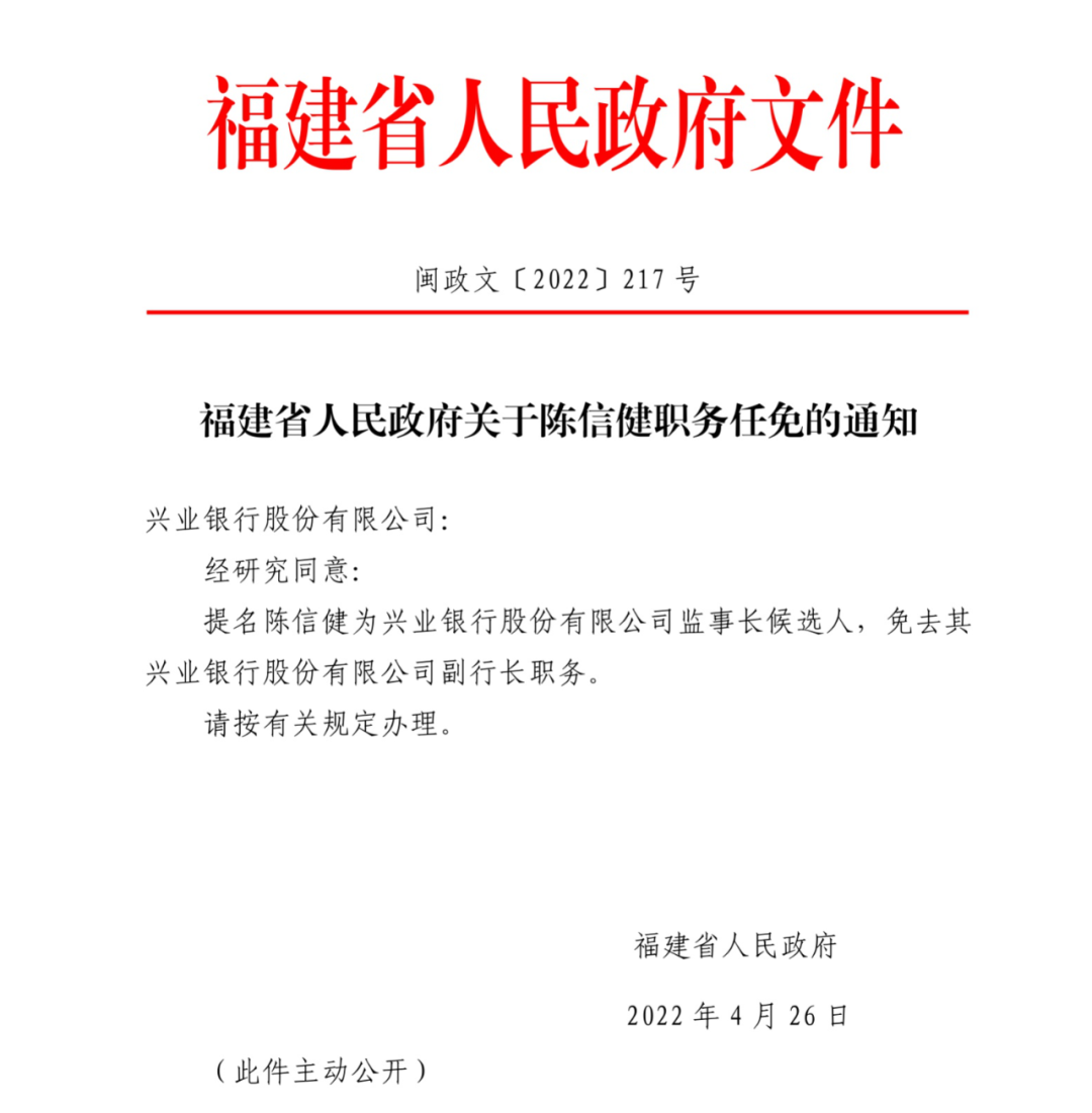4月26日,福建省人民政府发布了关于陈信健的职务任免通知,提名陈信健为兴业银行股份有限公司监事长候选人,免去其兴业银行副行长职务;