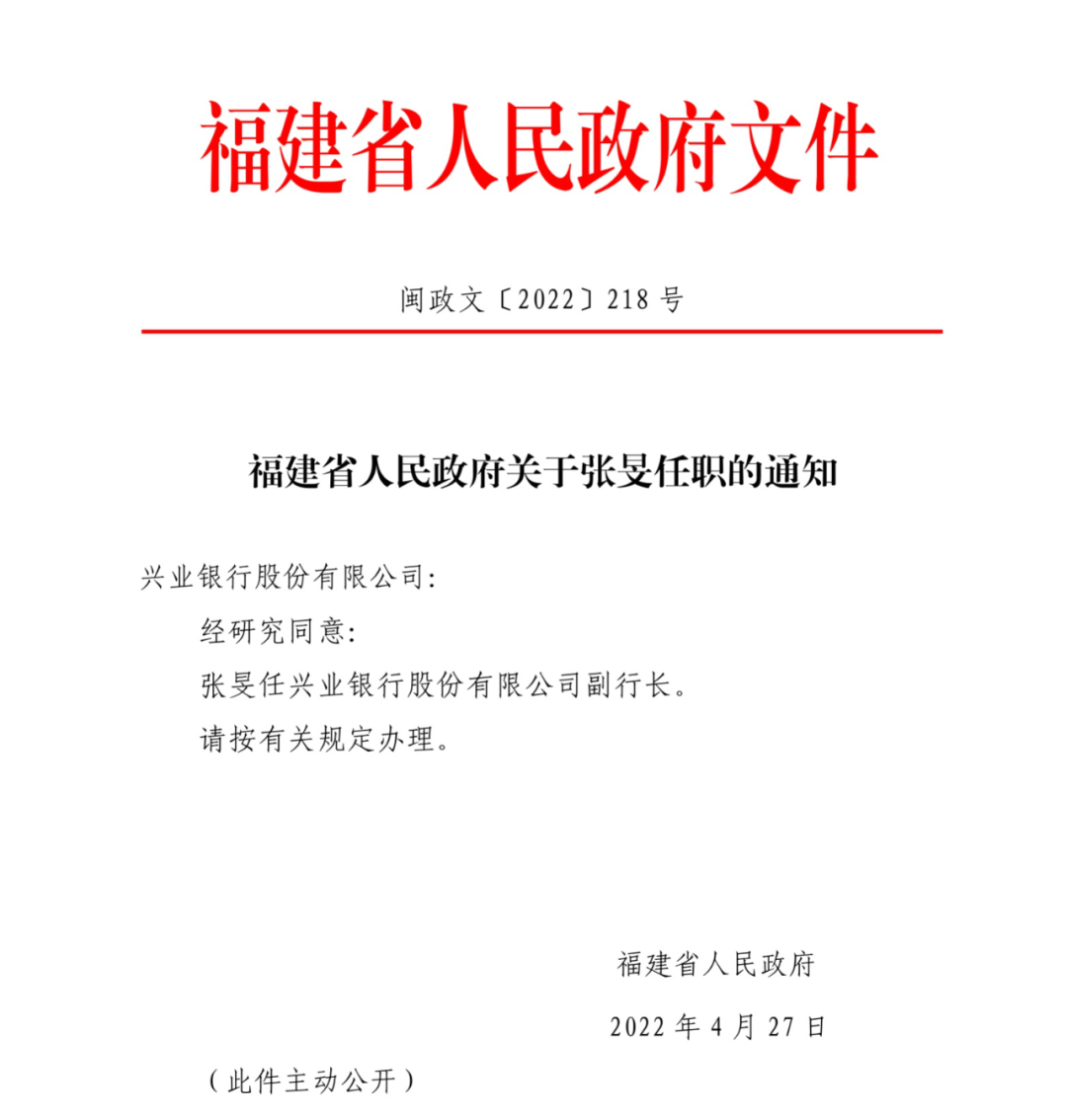 次日,4月28日,任命原杭州分行行长张旻为兴业银行股份有限公司副行长。