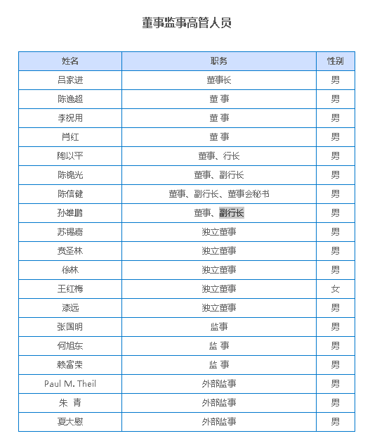 本次人事变动完成后,兴业银行领导班子为:董事长吕家进,行长陶以平,监事长陈信健,副行长为孙雄鹏、张旻。