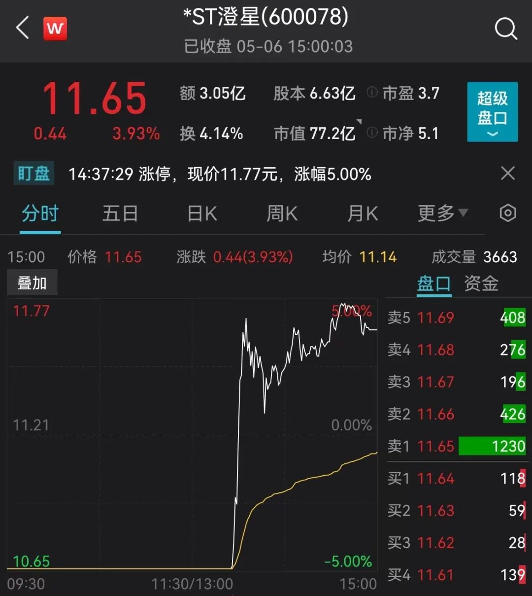 6日盘间,一直在跌停板上趴着的*ST澄星在13:30分时,突然翘板,直线拉升,一度触及涨停。最后收盘时,上涨3.93%。