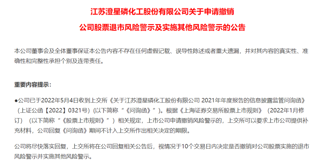 6日盘后,*ST澄星发布公告称,公司已于5月4日收到上交所《关于江苏澄星磷化工股份有限公司2021年年度报告的信息披露监管问询函》。根据《上海证券交易所股票上市规则》(2022年1月修订)相关规定,上市公司申请撤销风险警示的,上交所可以要求上市公司提供补充材料,公司回复《问询函》期间不计入上交所作出相关决定的期限。公司将尽快落实回复,上交所将在公司回复相关公告后,视情况于10个交易日内决定是否撤销对公司股票实施的退市风险警示并实施其他风险警示。