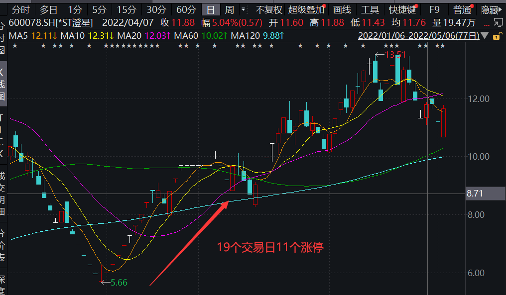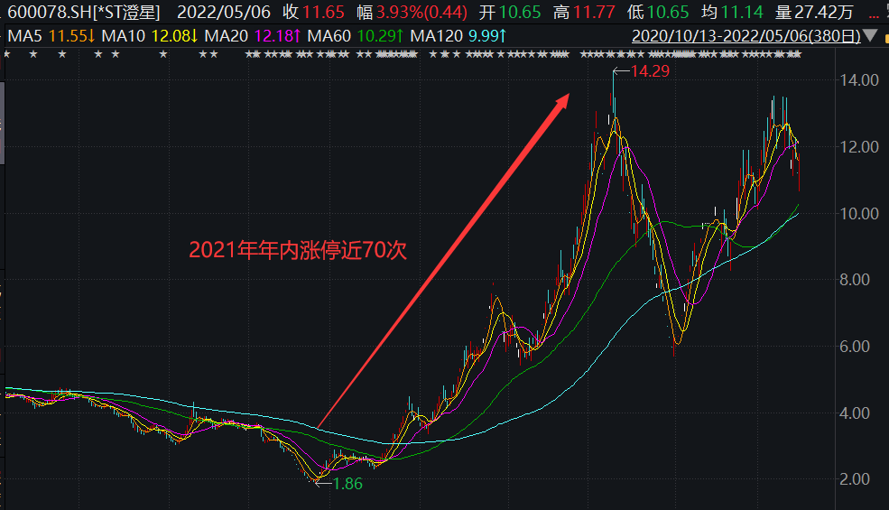 跌了快2个月,*ST 澄星春节之后,再度迎来了大反转。自2022年2月8日起至2月24日收盘,19个交易日里,*ST澄星累计11个交易日涨停,实现六个连板,股价从每股5.7元到9.7元,期间累计涨幅达70.18%。被称为“虎年最强妖股”。