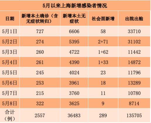 5月8日,上海无社会面新增确诊病例,社会面新增感染者9例。这是上海本轮疫情以来,社会面新增首次降至个位数。不过,9例感染者中,有8例来自防范区筛查。