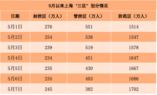 根据筛查结果,5月8日全市共划分封控区9829个,涉及人口数230万;管控区18281个,涉及人口数362万;防范区46464个,涉及人口数1737万。