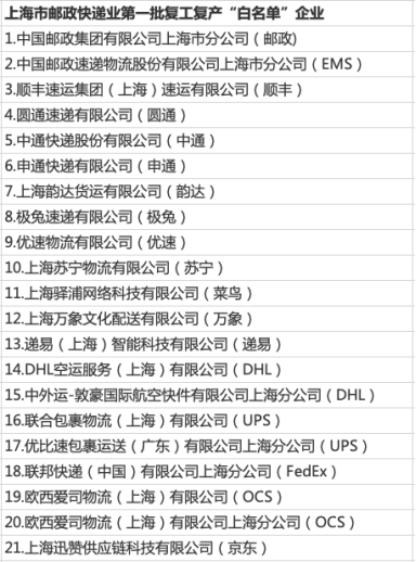 5月8日,上海市邮政管理局发布了上海市邮政快递业第一批复工复产“白名单”。