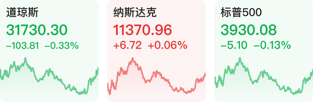 美股三大股指收盘涨跌不一。标普500指数跌5.10点,跌幅0.13%,报3930.08点;道指跌103.81点,跌幅0.33%,报31730.30点;纳指涨6.72点,涨幅0.06%,报11370.96点。生物制药板块领涨大市,辉瑞涨2.86%,默沙东涨1.86%,礼来涨1.73%。互联网科技股止跌回升,苹果跌2.69%,盘中一度跌超5%,微软跌2%,盘中跌4%。英伟达跌2.7%,盘中跌超6%。