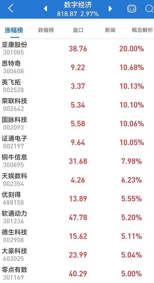 受此利好促进,今日A股数字经济概念全面走强。经过深度调整的东数西算板块一马当先,早盘放量高开高走,盘中一度大涨逾3%,半日成交超昨日全天成交,亚康股份20%一字涨停,荣联科技、证通电子等多股亦直线秒涨停;智慧政务板块盘中也涨逾3%,英飞拓等多股涨停;数字货币、国资云、数据中心等板块盘中均有不俗表现。