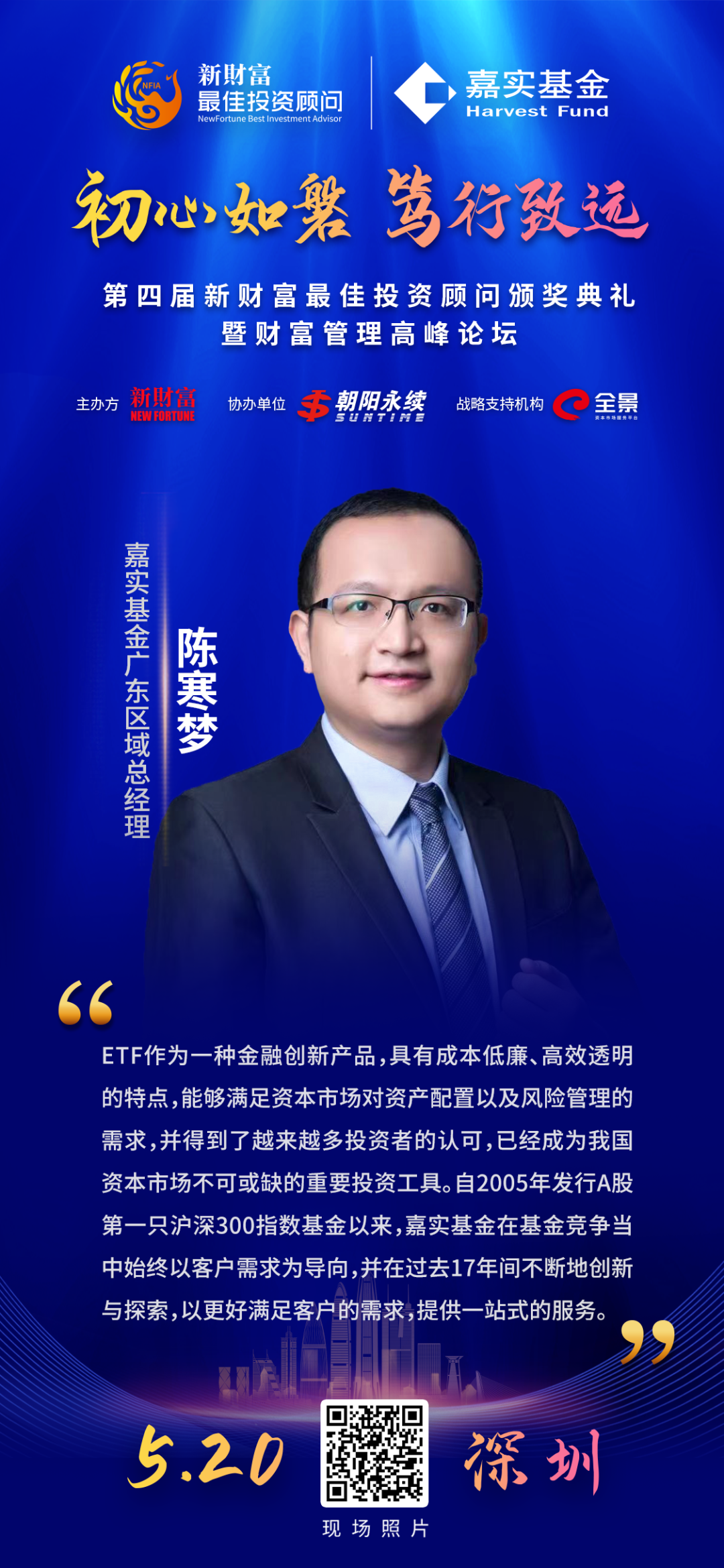 嘉实基金广东区域总经理陈寒梦,嘉实基金基金指数产品研究与发展部负责人吕玥先,广发证券总经理助理、零售业务管理总部总经理巫粤敏,朝阳永续副总经理李智,平安私人银行投顾总监兼投顾中心总经理黄程献等多位重量级嘉宾于开幕式做精彩主题演讲。