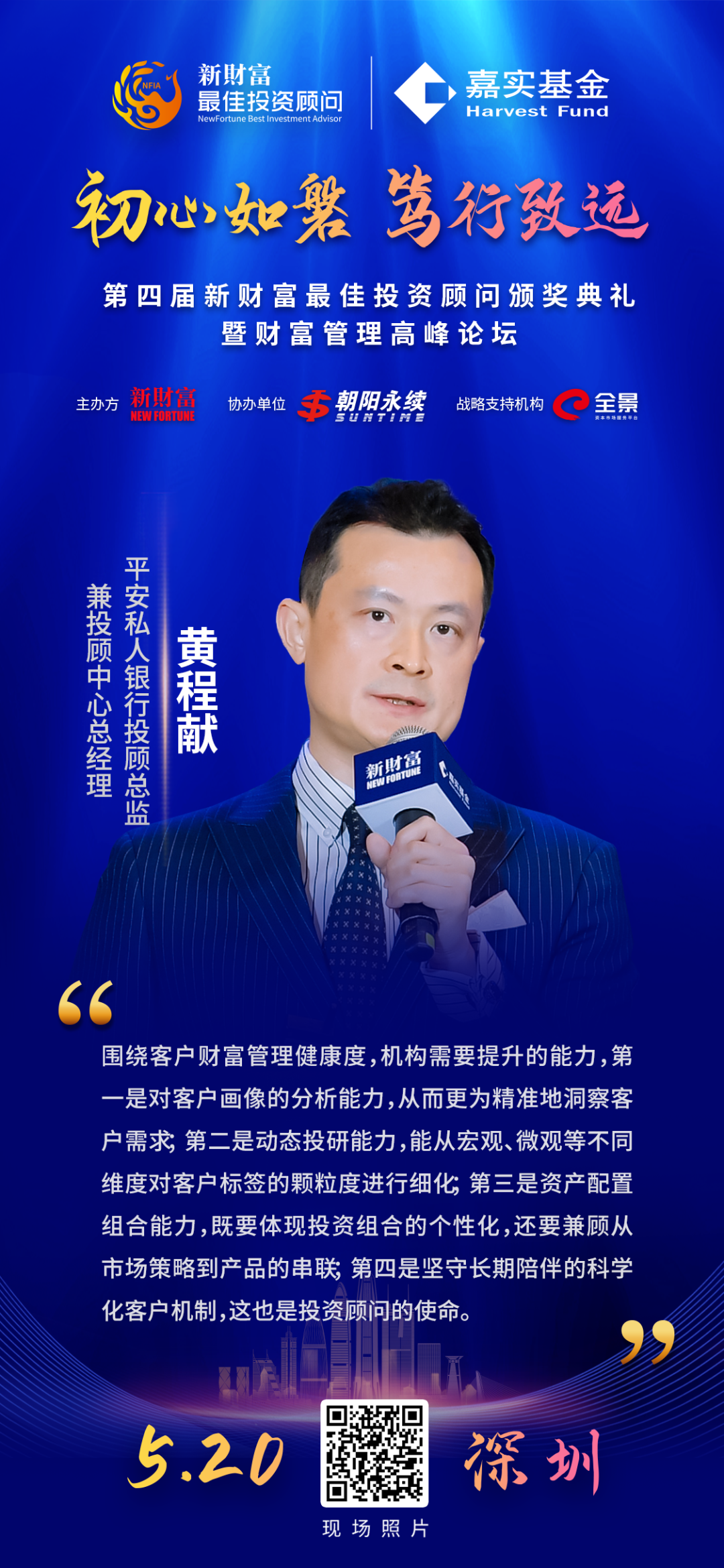 黄程献发表了“重塑财富管理生态—客户财富健康度在私人银行的实践”的主题演讲。他表示,围绕客户财富管理健康度,机构需要提升的能力,第一是对客户画像的分析能力,从而更为精准地洞察客户需求;第二是动态投研能力,能从宏观、微观等不同维度对客户标签的颗粒度进行细化;第三是资产配置组合能力,既要体现投资组合的个性化,还要兼顾从市场策略到产品的串联;第四是坚守长期陪伴的科学化客户机制,这也是投资顾问的使命。