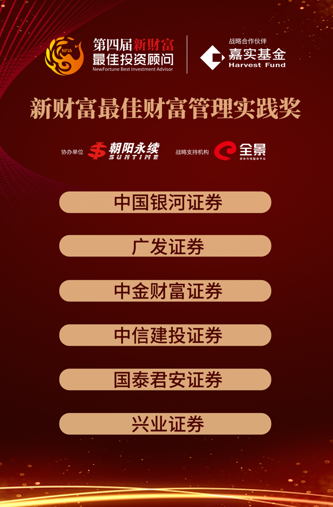 本次奖项的参考维度涵盖券商财富管理业务发展、基金投顾业务开展、公募基金保有量等,是对券商财富管理转型实践与创新,以及投资顾问团队发展的综合考量,中国银河证券、广发证券、中金财富证券、中信建投证券、国泰君安证券、兴业证券等6家券商荣获本届“新财富最佳财富管理实践奖”。
