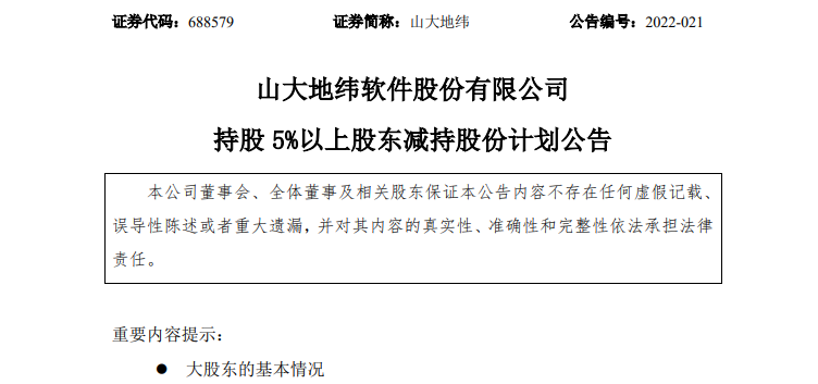 5月31日晚间,公司发布公告,持股17.09%股东国寿成达(上海)健康产业股权投资中心(有限合伙)(下称“国寿成达”)拟减持不超过3600万股,占总股本的9%股份。截至最新收盘,山大地纬股价为8.59元/股,若国寿成达按当前股价顶格实施本次减持计划,减持金额将超3亿元。