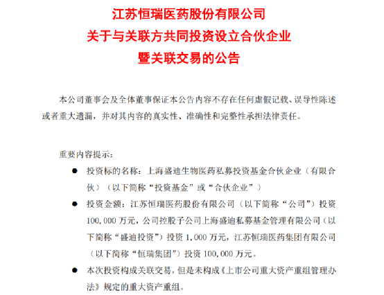 6月6日,恒瑞医药公告称,为提升公司资本运作能力,做深公司产业布局,公司拟与控股子公司盛迪投资、恒瑞集团签署《上海盛迪生物医药私募投资基金合伙企业(有限合伙)合伙协议》(以下简称“合伙协议”),共同发起设立合伙企业。