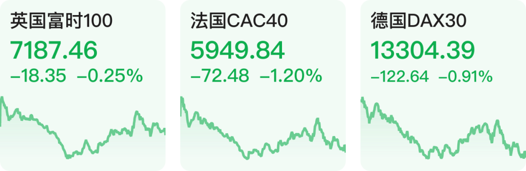 欧洲三大指数全部下跌。截至收盘,英国富时100指数跌0.25%,法国CAC40指数跌1.2%,德国DAX30指数跌0.91%。