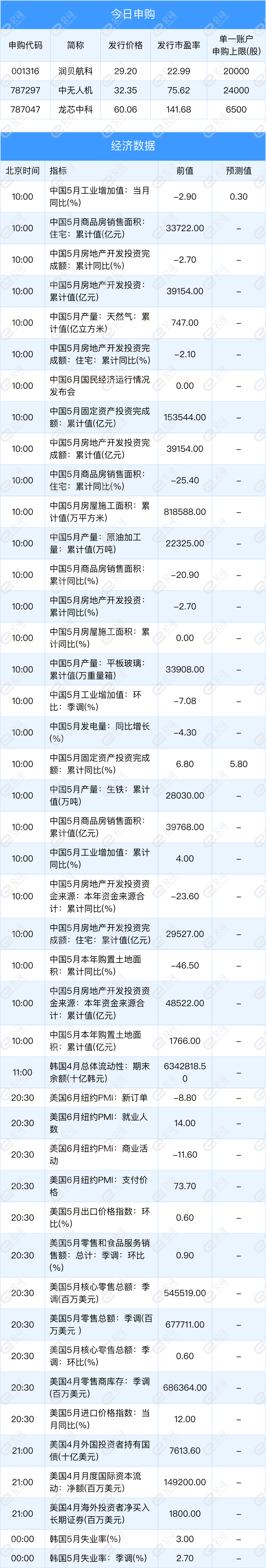 今日可申购润贝航科、中无人机和龙芯中科;国务院印发广州南沙深化面向世界的粤港澳全面合作总体方案;证监会:“要求外资投行报告高管薪酬细节”报道不实;央行:一季度末我国金融业机构总资产同比增长8.7%;发改委:自6月14日24时起国内汽、柴油价格每吨分别提高390元和375元;新三板2022年上半年分层完成,515家公司新进创新层;河南濮阳:实施“认贷不认房” 首套房首付最低两成;美股三大指数涨跌不一,中概股强势反弹。