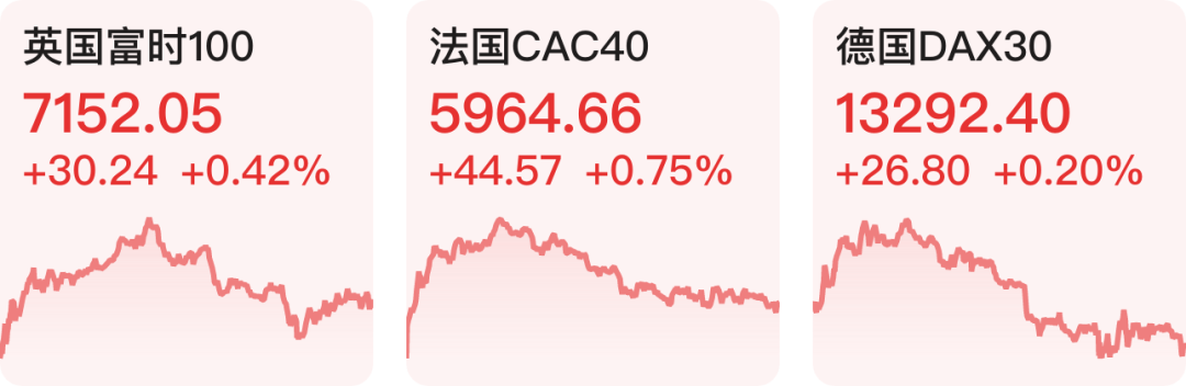欧洲三大指数全线上涨。截至收盘,英国富时100指数涨0.42%,法国CAC40指数涨0.75%,德国DAX30指数涨0.2%。