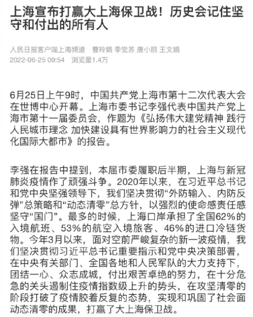 李强在报告中提到,本届市委履职后半期,上海与新冠肺炎疫情作了顽强斗争。2020年以来,在习近平总书记和党中央坚强领导下,我们坚决贯彻“外防输入、内防反弹”总策略和“动态清零”总方针,以强烈的使命感责任感坚守“国门”。最多的时候,上海口岸承担了全国62%的入境航班、53%的航空入境旅客、46%的进口冷链货物。今年3月以来,面对空前严峻复杂的新一波疫情,我们坚决贯彻习近平总书记重要指示和党中央决策部署,在中央有关部门、全国各地和人民军队的大力支持下,团结一心、众志成城,付出艰苦卓绝的努力,在十分危急的关头遏制住疫情指数级上升的势头,在攻坚清零的阶段打破了疫情胶着反复的态势,实现和巩固了社会面动态清零的成果,打赢了大上海保卫战。