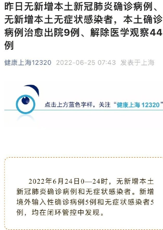 上海市卫健委通报,6月24日0—24时,上海无新增本土新冠肺炎确诊病例和无症状感染者。