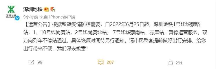 根据新冠疫情防控需要,自2022年6月25日起,深圳地铁1号线华强路站,1、10号线岗厦站,2号线岗厦北站,7号线华强南站、赤尾站,暂停运营服务,双方向列车不停站通过,具体恢复时间待另行通知。