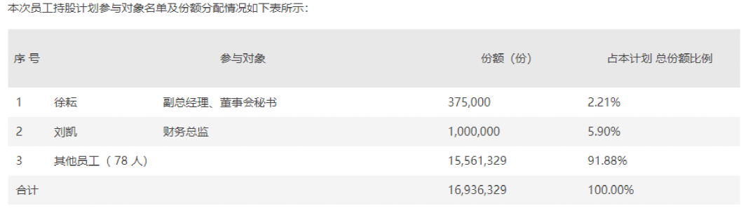 分配对象来看,包括副总经理、董事会秘书徐耘和财务总监刘凯在内的80名员工获得参与资格,占公司2021年度报告期末员工总数10667人的0.75%,基本是百里挑一。其中财务总监一人获配5.9%的份额,价值约99.89万元。开润股份表示,公司实施本员工持股计划遵循公司自主决定、员工自愿参与的原则,公司不以摊派、强行分配等方式强制员工参与本员工持股计划。