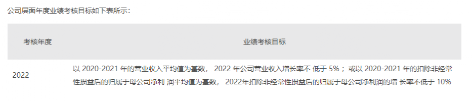此次考核条件分两条,“以2020-2021年的营业收入平均值为基数,2022年公司营业收入增长率不低于5%”或“以2020-2021年的扣除非经常性损益后的归属于母公司净利润平均值为基数,2022年扣除非经常性损益后的归属于母公司净利润的增长率不低于10%”。