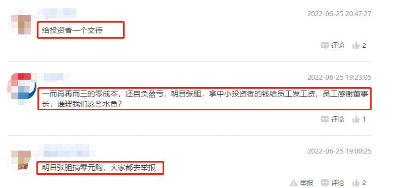 “明目张胆搞0元购”“只为一小撮人谋福利”“拿中小投资者的钱给员工发工资,员工感谢董事长,谁理我们这些水鱼?”……