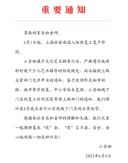 今年6月1日,上海全面复工复产后,小音咖和其他教培机构一样,并未及时恢复线下教学活动。6月6日,小音咖发出通知称,将遵守防疫要求,预计6月底左右可实现线下门店正常运营。