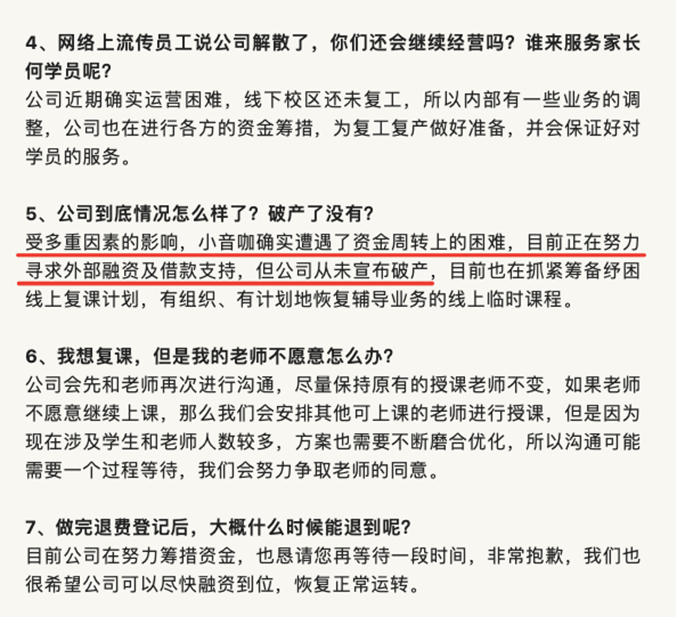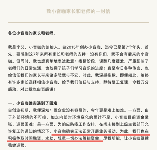 不过,6月10日前后,网络上就出现小音咖资金链紧张,无法继续运营,将给家长退费等传闻。6月12日,小音咖澄清称,公司尚处于继续运营状态,将积极恢复线下门店的正常运营。