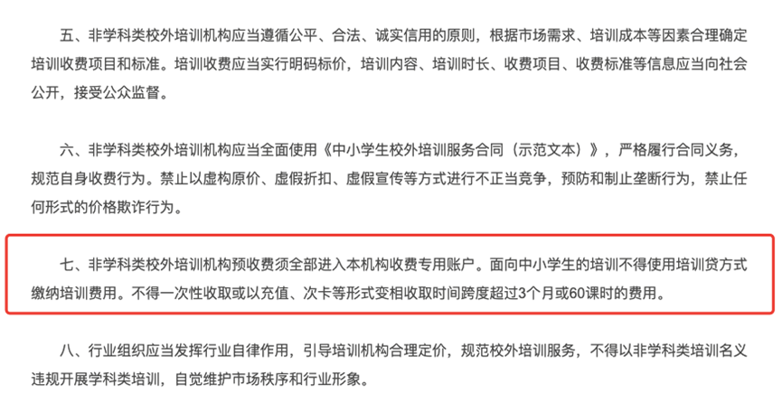 今年3月初,教育部等三部门再次发布公告,非学科类校外培训机构预收费须全部进入本机构收费专用账户,不得一次性收取或以充值、次卡等形式变相收取时间跨度超过3个月或60课时的费用。