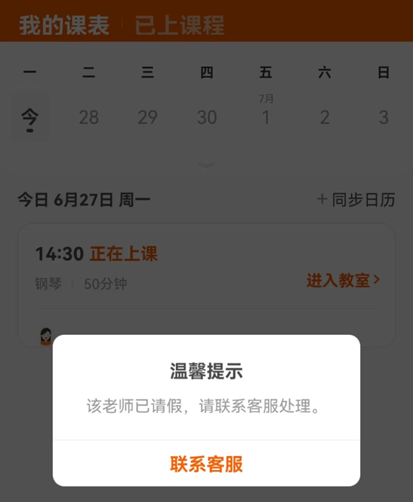 6月26日,记者尝试在VIP陪练平台预约6月27日的课程。虽然能够正常预约,但到了约定的上课时间却显示“该老师已请假”。